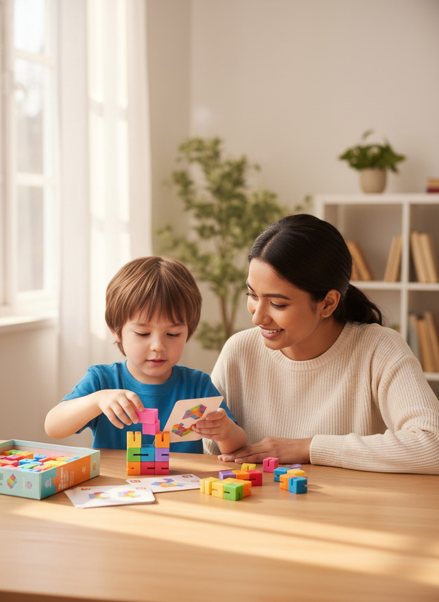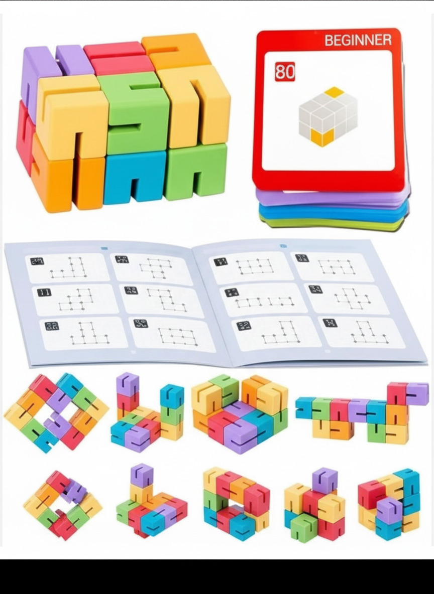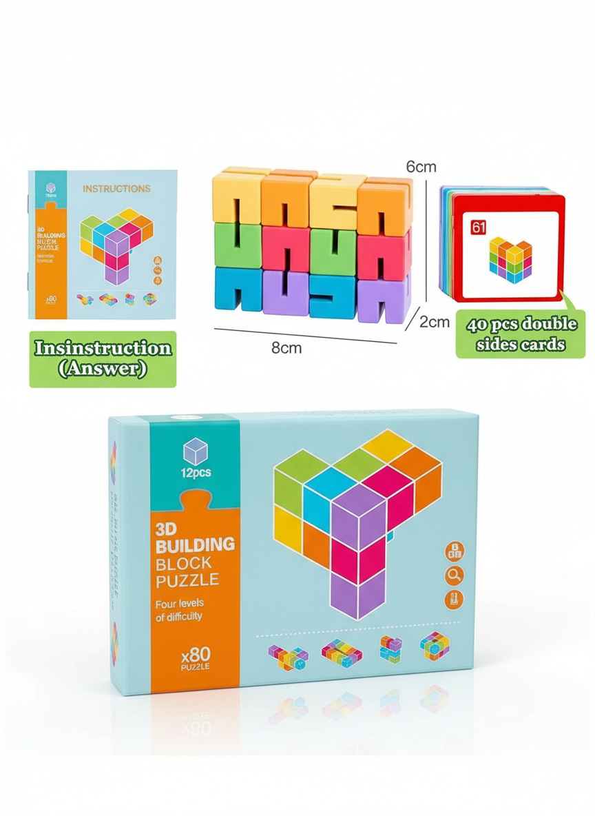 عبة بازل ثلاثية الأبعاد (3D) مكونة من 12 قطعة خشبية بأشكال مختلفة، الهدف منها إن الطفل يجمع القطع دي مع بعض علشان يكون أشكال ومجسمات معقدة زي اللي موجودة في كتالوج التحديات.