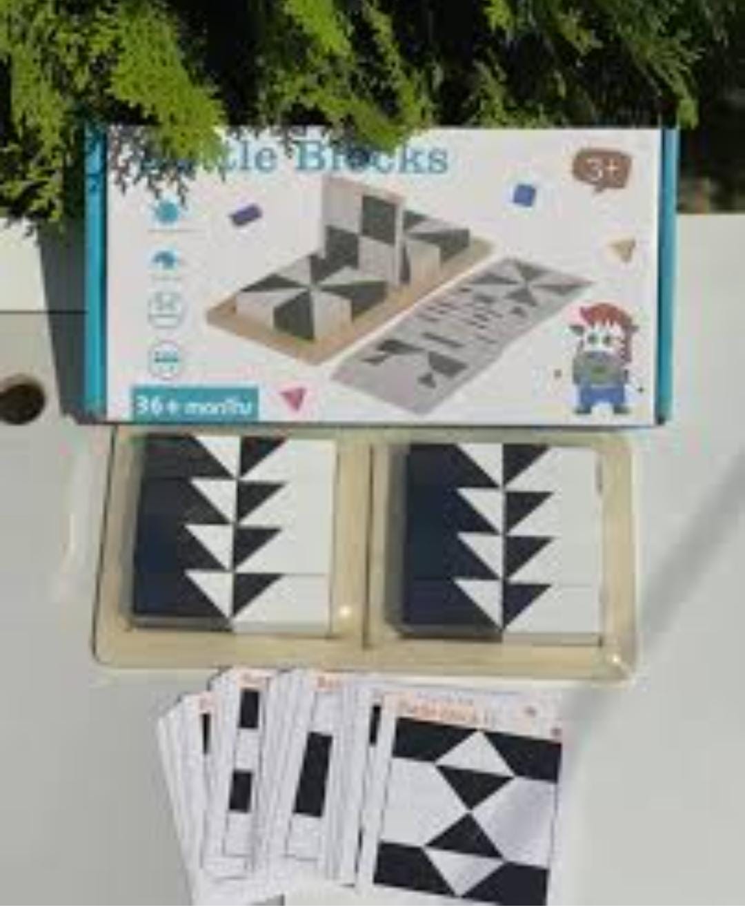 – – لعبة تناسب الأطفال من 3 سنين وطالع. – عبارة عن قاعدة وشبكة فيها مربعات بالأبيض والأسود. – الهدف ترتيب القطع بشكل معين حسب البطاقات المرفقة. – بتساعد على تنمية التفكير المنطقي والمهارات البصرية