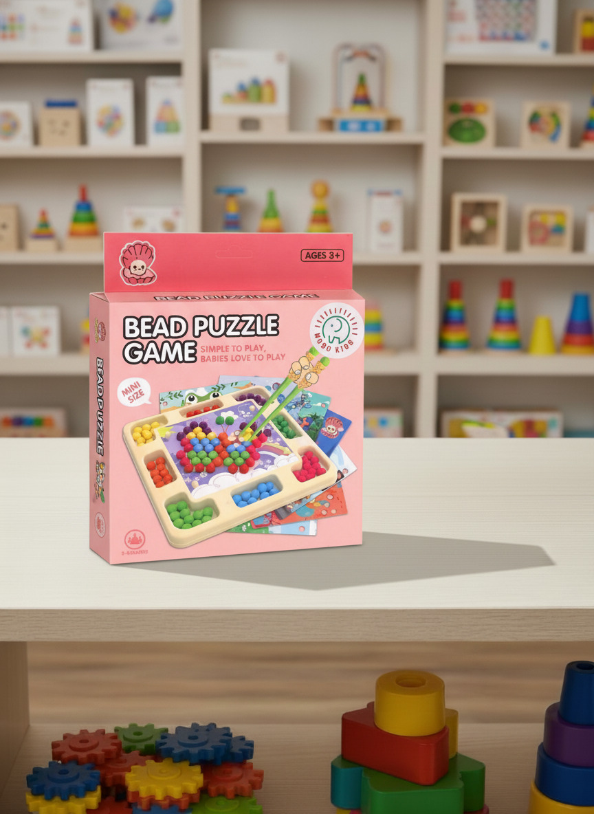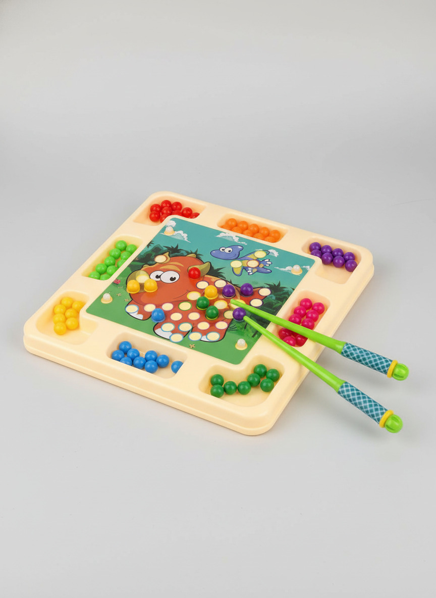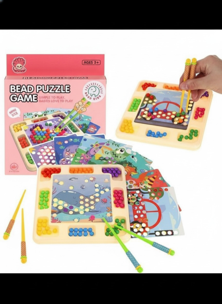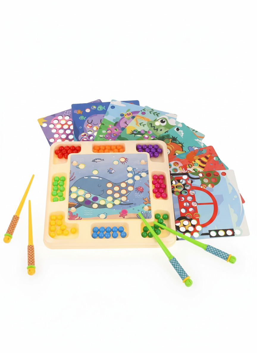 لعبة فنية وتنموية بتعتمد على التنسيق بين الإيد والعين. الطفل بيستخدم “المقص” أو الملقط المخصص عشان ينقل الخرز الملون ويحطه في مكانه الصح على الكروت عشان يكوّن أشكال وصور مبهجة.