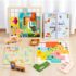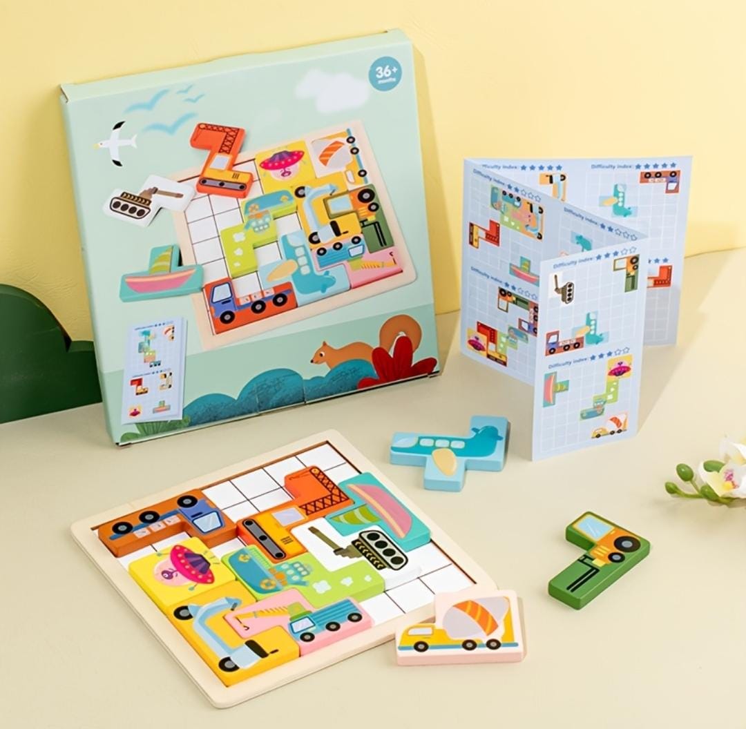 1. فيها قطع خشبية بأشكال مختلفة لأدوات ومركبات زي الرافعات والجرارات والشاحنات.