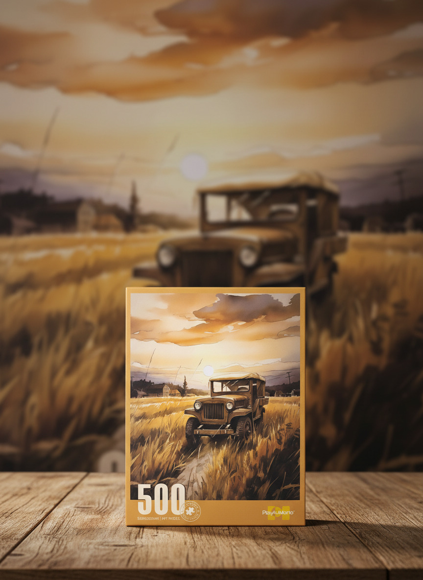 تجميع لوحة زيتية رائعة لسيارة جيب كلاسيكية وسط الحقول وقت الغروب. اللعبة عبارة عن 500 قطعة، وده بيخليها تحدي ممتع ومحفز للعقل.