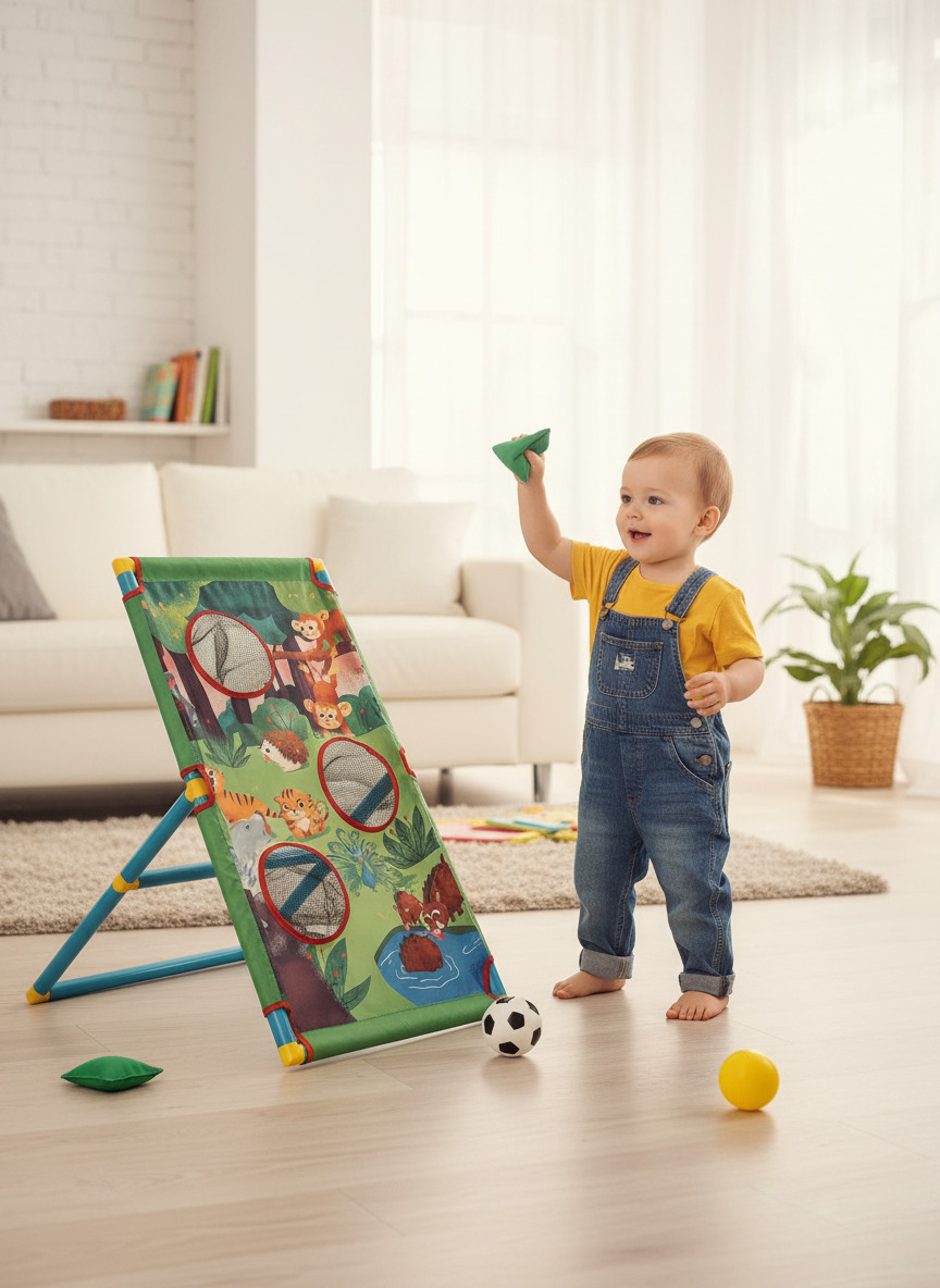 الطفل بيحاول يرمي كرات القماش الصغيرة (Sandbags) على اللوحة ويصيب الدواير أو الأهداف المختلفة. كل هدف ليه درجة معينة، والطفل يحاول يجيب أكبر عدد من النقاط.