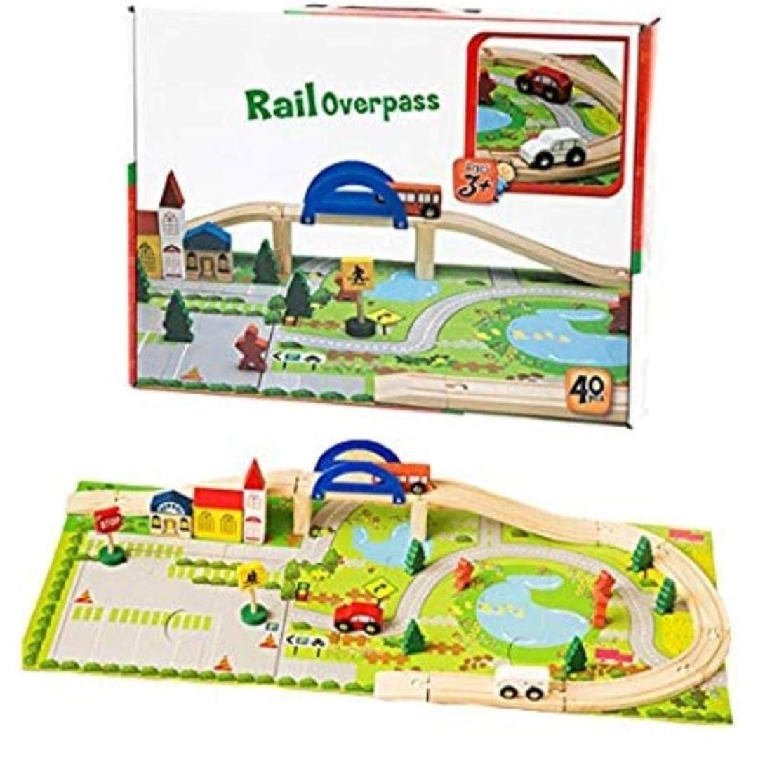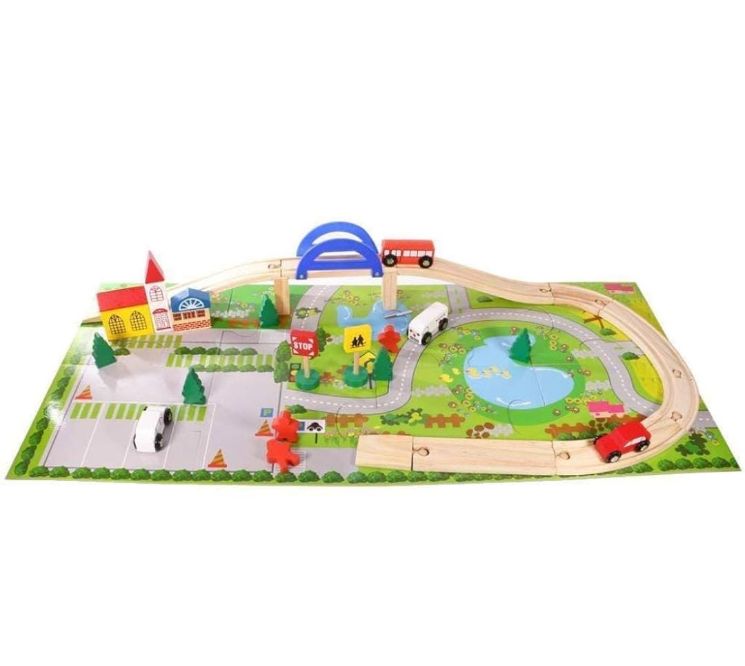 – اللعبة فيها 40 قطعة بتتجمع لتكوين طريق وسكة حديد مع جسر فوق الطريق. – فيها شوارع، علامات مرور، ومباني صغيرة بتخليها مشهد مدينة مصغر. – بتساعد الأطفال يتعلموا الترتيب، التنسيق بين اليد والعين، وتنمي خيالهم في اللعب.